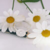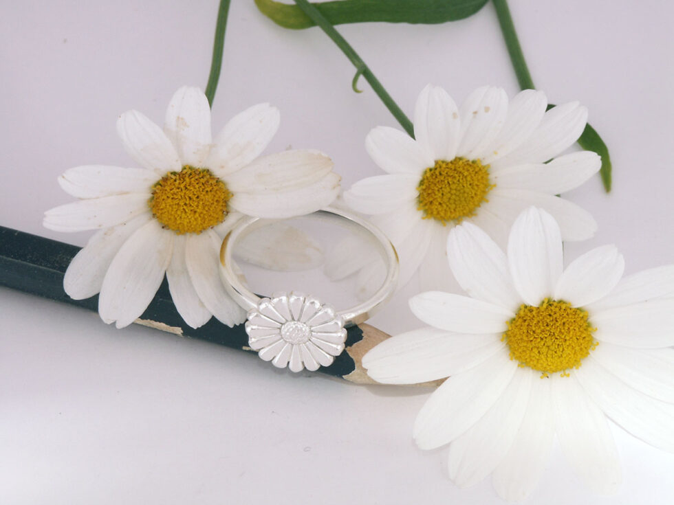 Marguerit ring i sølv, ringskinne med grene 1,10 mm, 2,25 mm bred og 1,40 mm tyk, blomst diameter 11,5 mm og 1,25 mm tyk, overflade er silkemat.