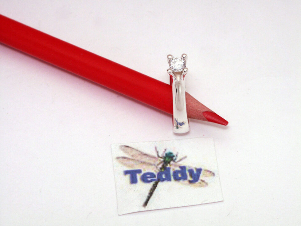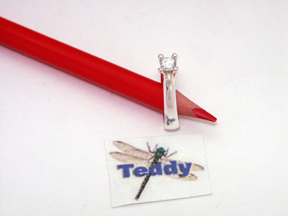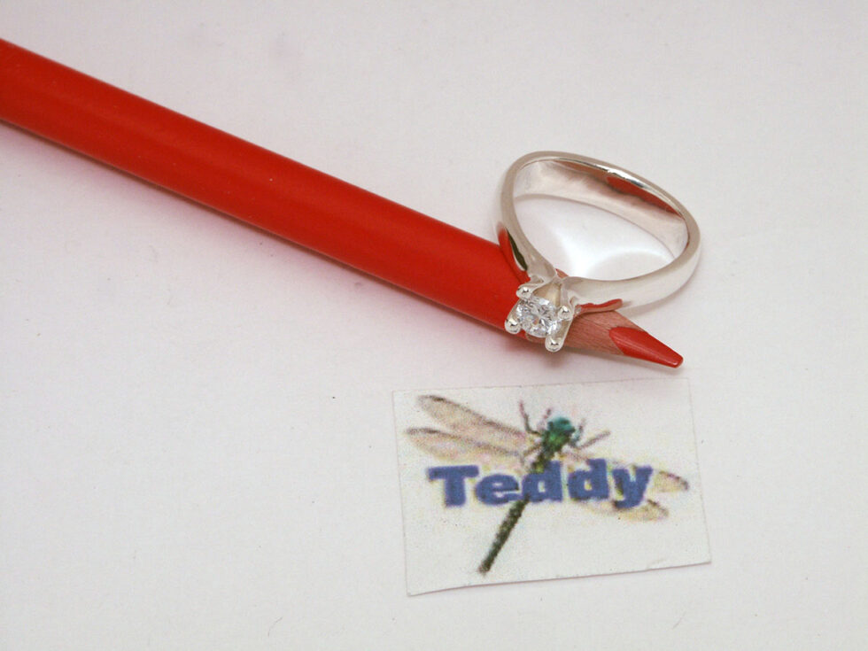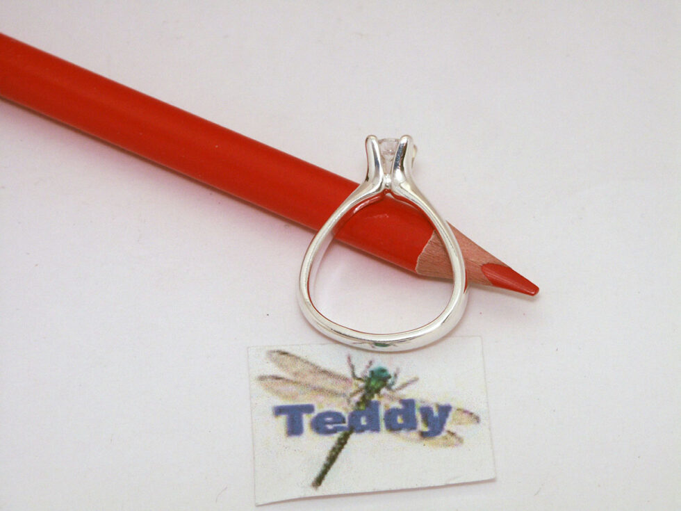 Ring i sølv 925S med 4 greb og 4 mm hvid cub. zirkonia, ringskinne er trekant forme, overflade blank poleret.