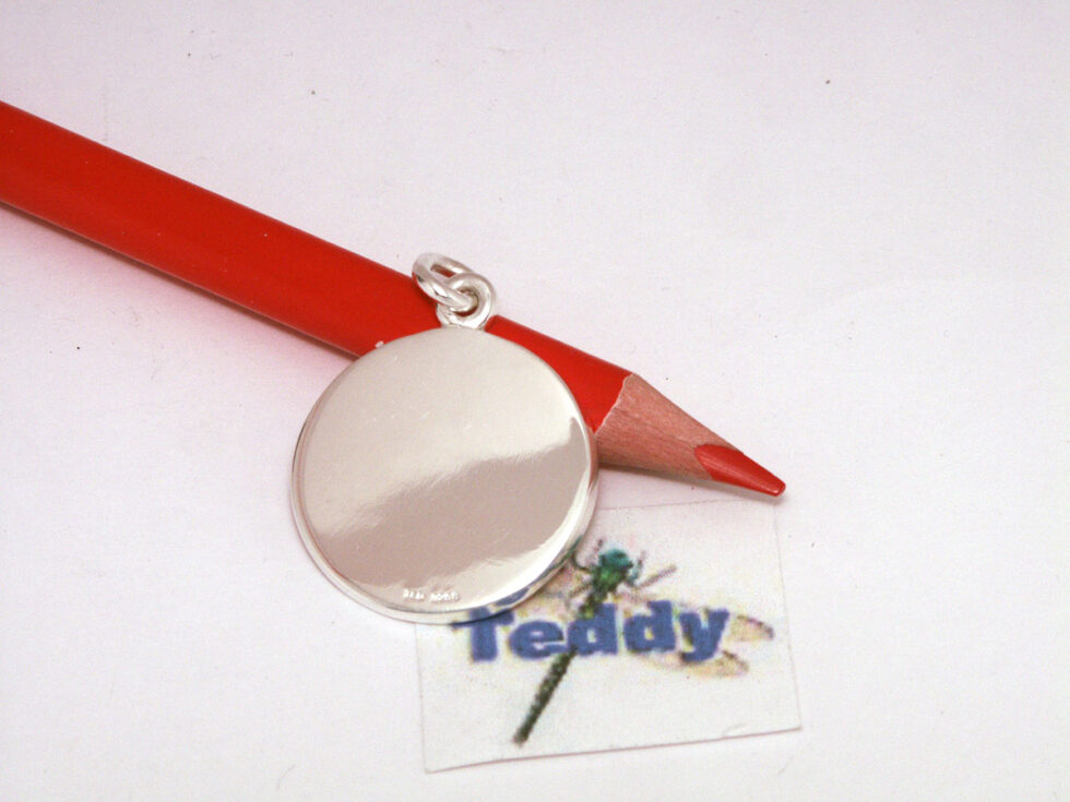 Vedhæng i sølv til kæde, gummi snøre og læder snøre, størrelse: diameter 2 cm og bagplade blank poleret til Graveres.